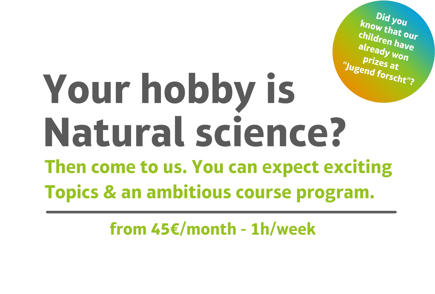 The courses will take place if there are at least 8 registrations per course (except Jugend forscht). If more than 12 children register, two courses are offered.